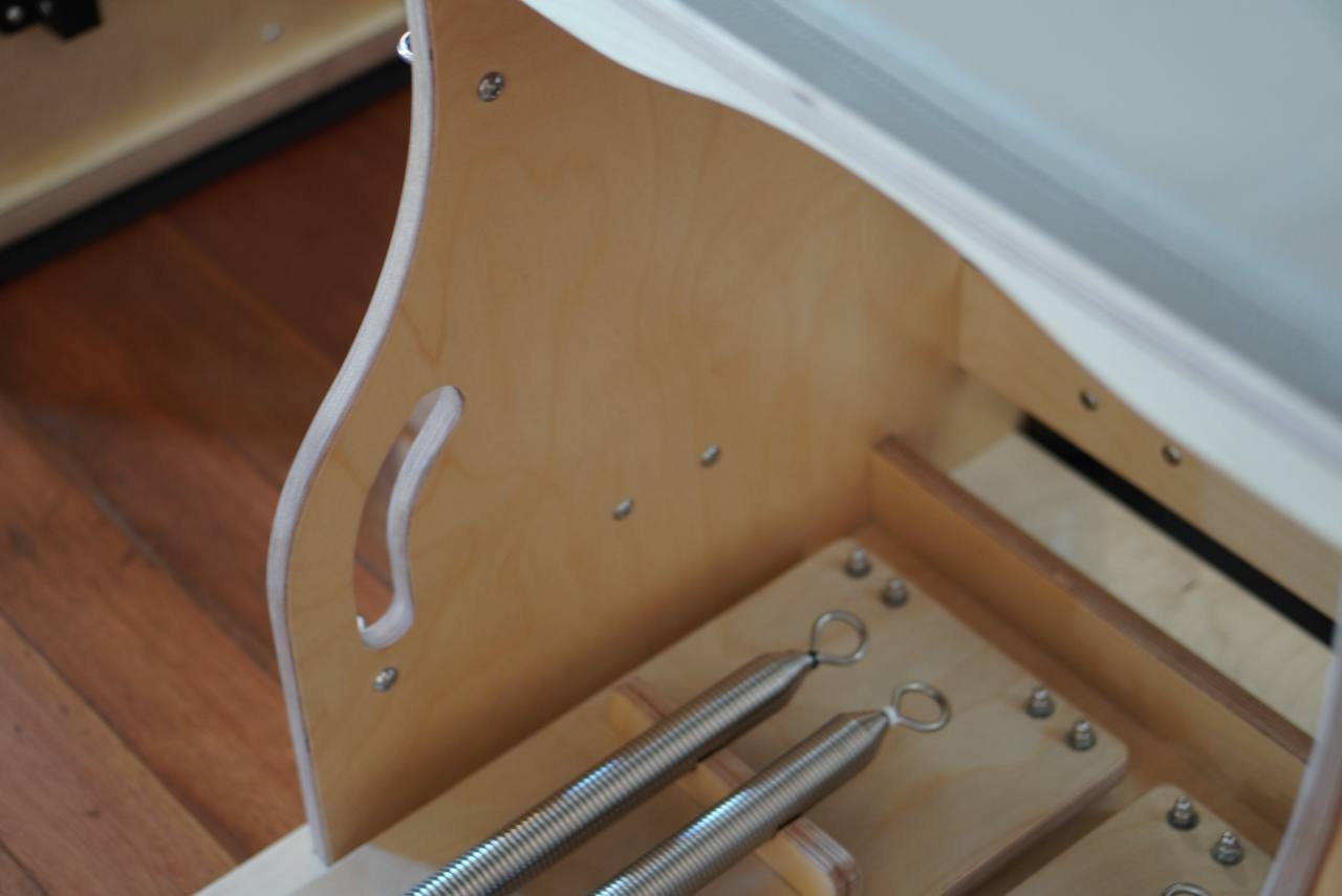 Close-up of a partially assembled wooden toy or furniture piece with metal springs and screws.